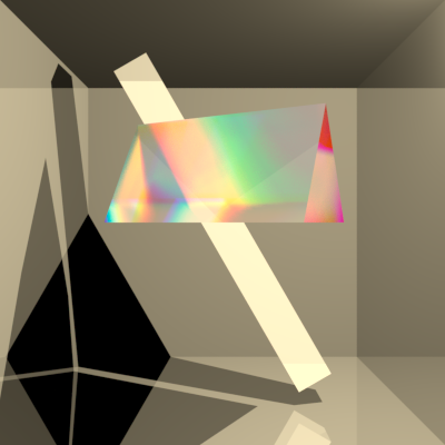 | This ray tracer encodes light not just as the typical RGB values, but instead as a function of wavelength. This makes it possible produce effects such as the casting of light through a prism into a rainbow of colours. Some of the images you see here required literally hundreds of hours of rendering time (can you guess which one?), but Dan has distributed the work to be done over multiple machines. |