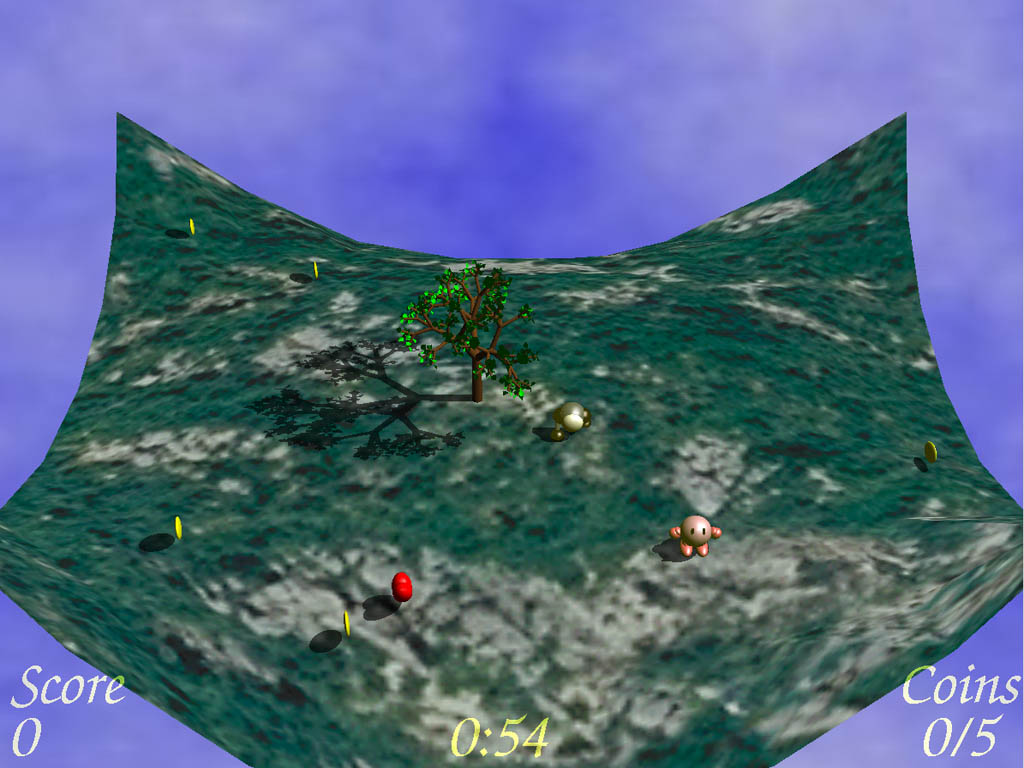 | This arcade-style game features PoPo, who must collect coins over a spline terrain while avoiding the dangerously explosive robot. Background music and sound effects further enhances the gaming experience. Last but not least, the level of detail for the terrain and L-system tree can be increased or decreased on the fly. |