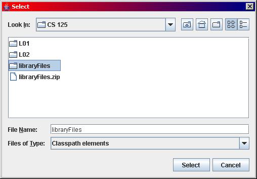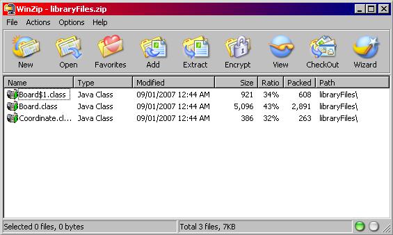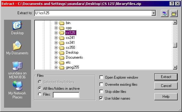 | Extract the files to U:\cs125. (If you are at home, you can substitute the correct drive letter for <U:>, eg. <C:>). It will then create a folder called "library" automatically. This folder contains the Board.class and Coordinate.class files that are needed. |