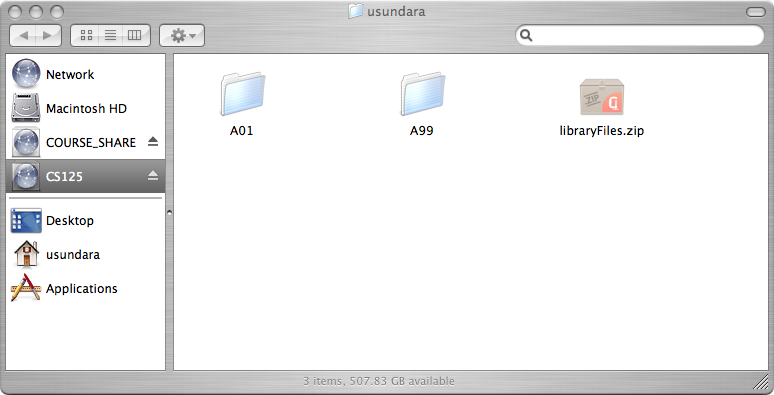 | Navigate to the folder you saved it to (Should be your CS125 folder if you finished Lab01). Check to see if you have a libraryFiles folder. If not, double click to extract it. You should now have a libraryFiles folder in the same folder. | ![]() |