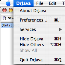 | Open DrJava, and click on its name in the top left corner. Choose Preferences from the menu. | ![]() |