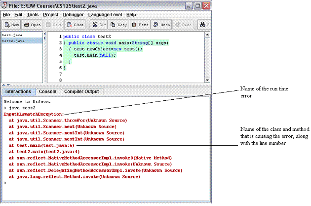 It is important that you can interpret error messages that the compiler displays. The message provides many useful clues to the problem at hand. Hence, you can debug your program much more efficiently if you understand its meaning. It is displayed in the Compiler Output pane (for a compilation error) or in the Interactions pane (for a run time error). Compilation errors are relatively easy to understand. Below is a screenshot of what they typically look like: