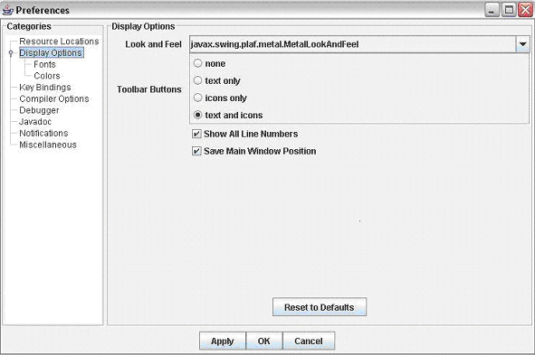 The Java Compiler outputs lines that contain run time errors. This is really helpful when debugging, as we do not have to look at all lines of code, instead focusing on a smaller block. By default, Dr. Java does not display line numbers. To turn on this option (and see the line that is generating the run time error), click on the Edit menu, and the Preferences option. Then, click on Display Options (second item on the left hand side), put a check mark for "Show all line numbers", and press OK. Below is a picture of what you should see when toggling on this option: