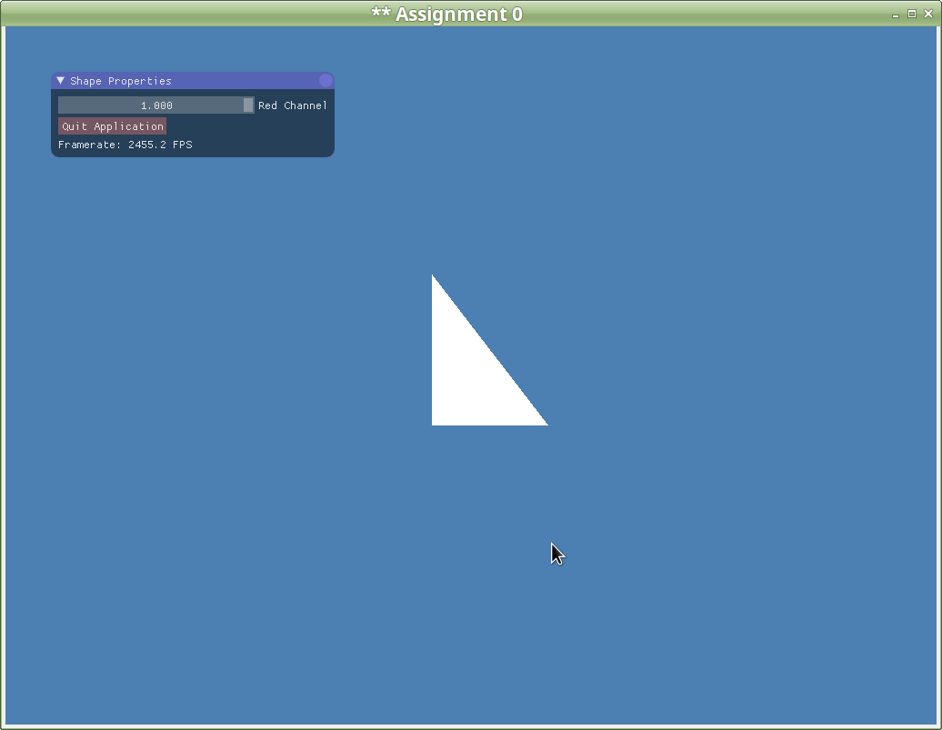 - Between the Quit button and the sliders, add a Reset button that sets the triangle back into its original state (colour, scale, rotation, position). Add a keyboard shortcut, so that the R key resets.