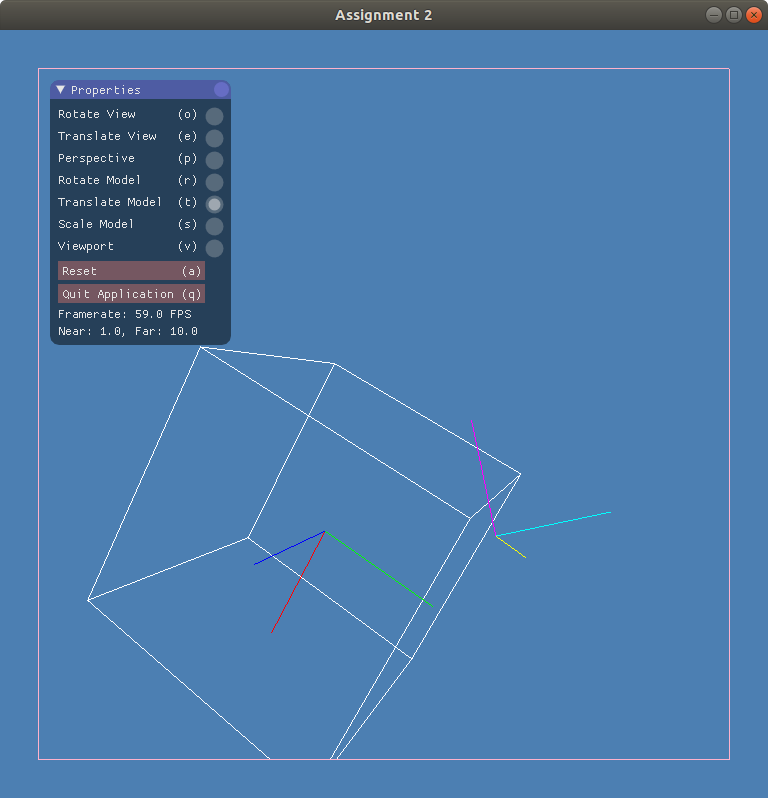 You should construct your cube using the eight vertices (±1, ±1, ±1). You must also draw two coordinate frames (sometimes called gnomons in this context). The first will represent the cube's local modelling coordinates; its origin is the cube's centre, and it will be subjected to every modelling, viewing and projection transformation applied to the cube, except for scaling. The second will represent world coordinates. These will be the same size as the modelling axes, but they will remain fixed at (0,0,0)—they will be subjected only to the viewing and projection transformations. Draw each gnomon so that its x, y, and z axes are visually distinct; the most obvious means of doing so is to draw them with different colours. (Though these coordinate frames are conceptually of unit length, you'll probably want to scale them when drawing them in order to ensure they're visible on screen.)