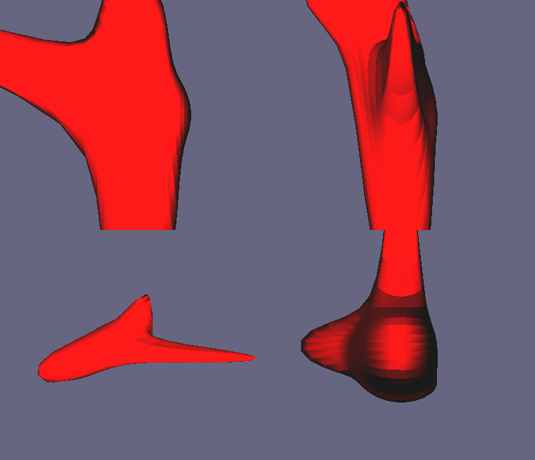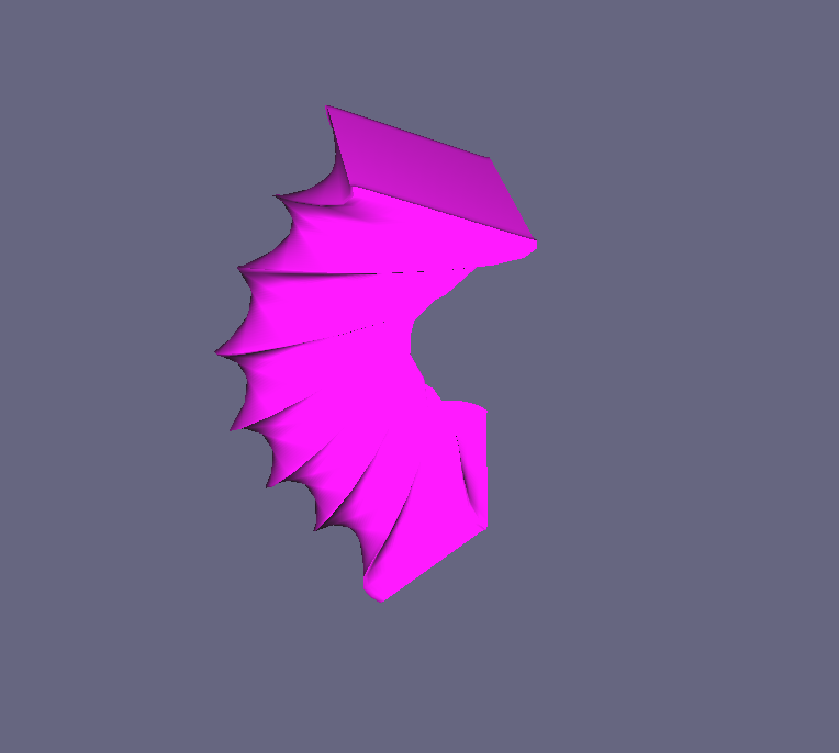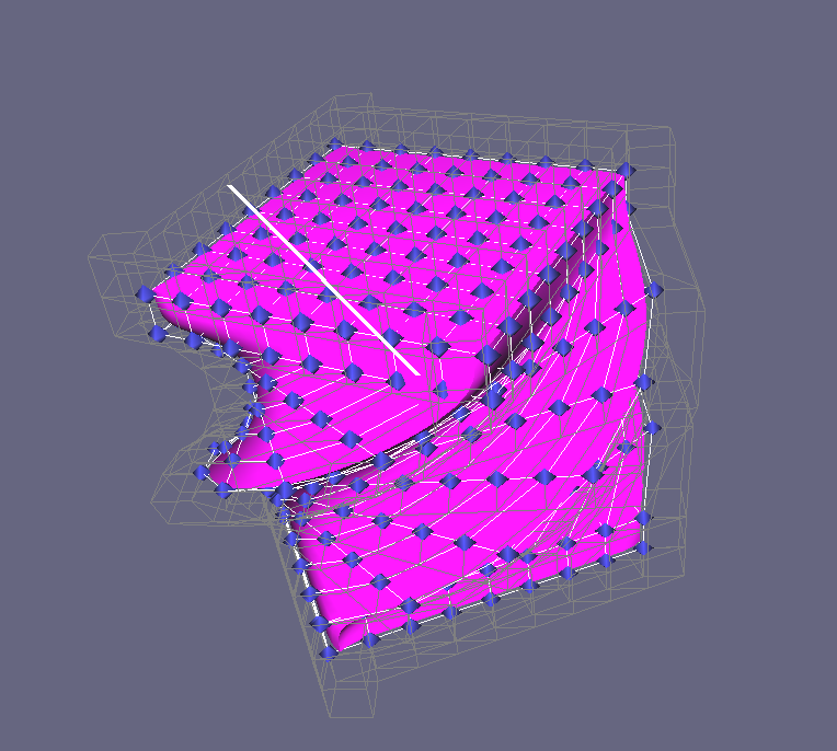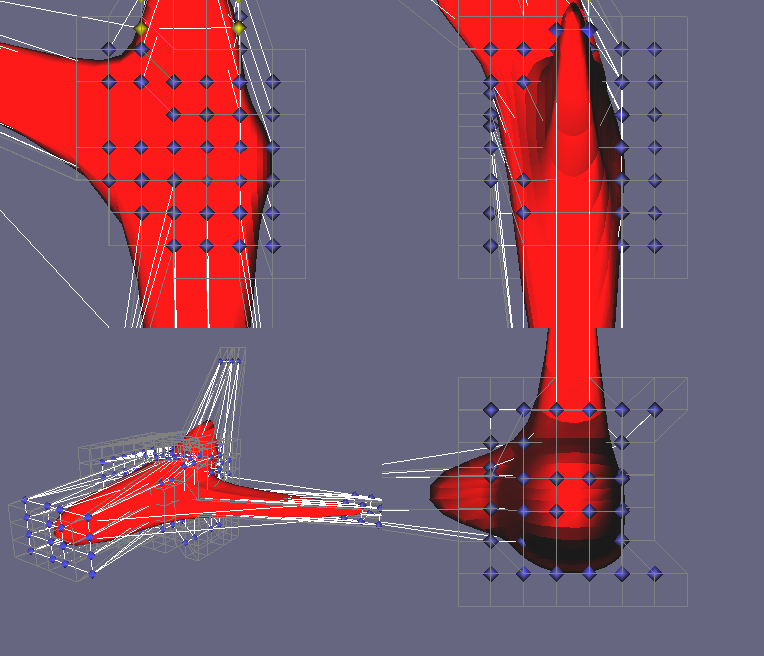 | The second type of stretch is done by drawing a "curved" line, and dragging the line to locally stretch squash the lattice box. The curve and the displaced curved is projected like a beam; any lattice points within the beam gets stretched. Again, the amount of stretch is determined like the first type. The other two types of gestures, twist and bend, were implemented more robustly. Twist can be configurable to twist only certain "levels" in the lattice. Bend can bend according to arbitrary axis, depending on the current view. One other feature that was implemented was local selection. Certain parts of the model can be selected, bound with a lattice, and the deformation is only applied locally to those parts. |