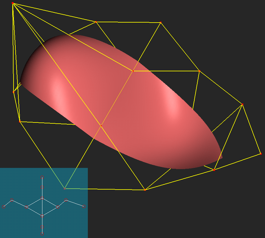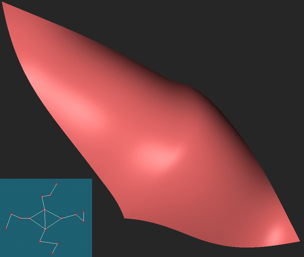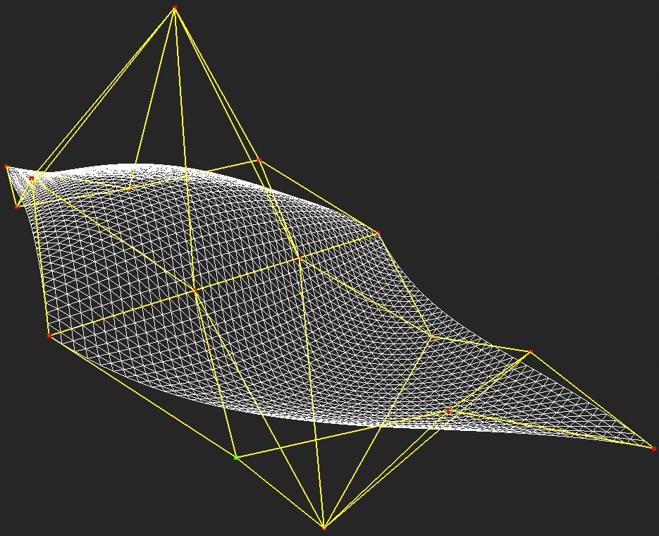 However, the cost is worth the reward in the end. No matter where you move the control points, if the knot clouds are set up such that none of the underlying simplex splines have collinear points, then the patches will meet with Cn-1 continuity automatically. As with B-Patches, if all the points in the knot cloud are coincident, the patch reduces to a Bezier patch.